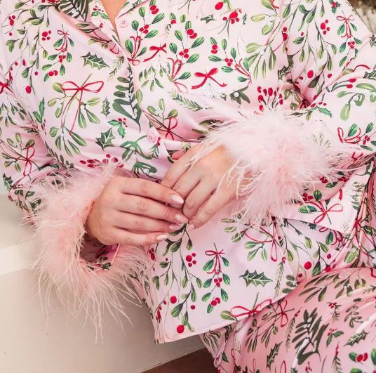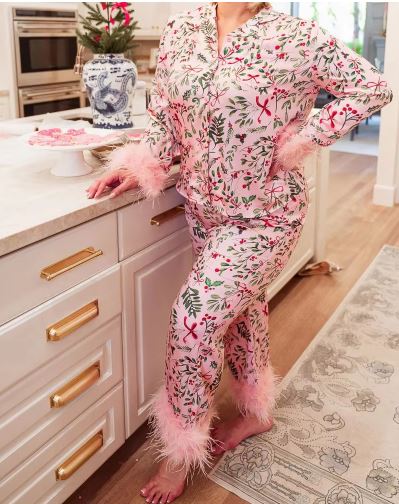 Luxurious feather-trimmed Christmas pyjama for women